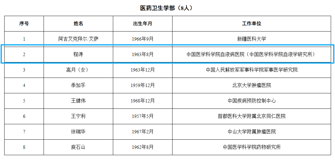 程涛,1963年8月出生,江苏省连云港人,中国农工民主党党员,北京协和医学院首批长聘教授、博士生导师,干细胞与再生医学系创始主任。1981-1989年就读第二军医大学,获医学硕士(血液内科)。随后任第二军医大学长海医院血液内科医师、主治医师/讲师。1993年赴美国哈佛医学院等机构学习和工作,曾任美国匹兹堡大学终聘教授,2007年7月引进回国。现任中国医学科学院血液病医院(中国医学科学院血液学研究所)所院长,分管所院办公室、学科建设办公室、信息与资源中心,临床试验平台(含GCP临床药理基地和I期病房);负责联系干细胞移植中心,以及国家血液系统疾病临床医学研究中心、血液与健康全国重点实验室、细胞生态海河实验室、国家干细胞工程技术研究中心。兼任中国医学科学院基础医学研究所(北京协和医学院基础学院)所院长、中国医学科学院天津医学健康研究院副院长、血液与健康全国重点实验室主任、细胞生态海河实验室常务副主任。 从事血液学和干细胞生物学研究、教育及相关管理工作。主持国家杰出青年基金、重大科学研究计划、重点研发计划、基金委重大项目和创新研究群体等科研项目10余项。在国内外著名期刊发表论文260余篇,获授权发明专利23项,主编和参编中英文专著10部,曾或现任国际实验血液学会理事、中国生理学会副理事长&血液学专业委员会主任委员、中国医院协会血液学机构分会主任委员、中国病理生理学会实验血液学会副主任委员、中国细胞生物学会干细胞生物学分会副会长等学会职务。曾或现任Blood、Leukemia、Blood Advances、Stem Cells、Stem Cells Translational Medicine、Experimental Hematology、Blood Science等国际期刊编委、副主编或主编。 获国家杰青、基金委创群、天津市首批杰出人才、科技部和教育部创新团队等人才项目。以第一完成人获国家自然科学二等奖1项、天津市自然科学奖特等奖和一等奖各1项。带领血液病医院连续13年蝉联血液学专科声誉榜首、连续10年获血液病学科技量值第一名,为中国血液学科技创新核心基地的建设做出了重要贡献。